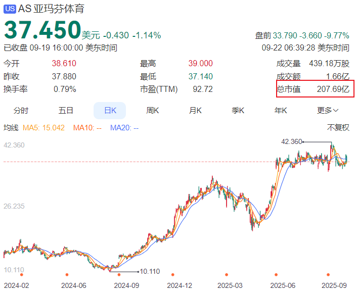 始祖鸟本是亚玛芬体育旗下高端户外服饰品牌,近年来在国内大受欢迎,被称为“中年三宝”、“中产三宝”。2018年,安踏体育牵头腾讯等,要约收购亚玛芬,2024年亚玛芬成功在美国纽交所上市,成为2023年9月以来全球最大规模IPO,发行价为13美元,总市值达到64.92亿美元(约合人民币466亿元)。上市以来,其股价持续上涨,截至目前,其股价已涨到37.450美元,市值达到207.69亿美元,较发行时涨了2倍多。
