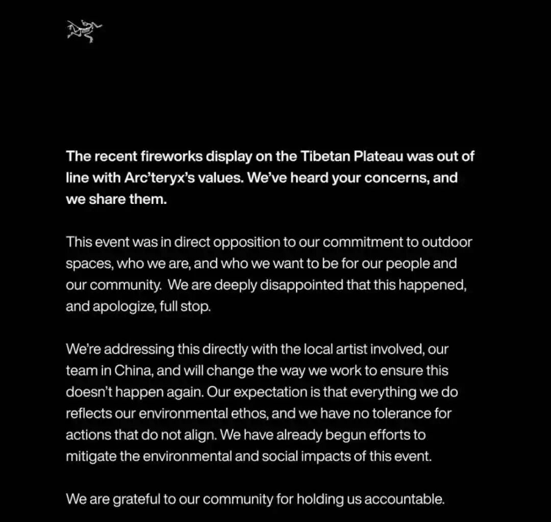 始祖鸟之前辩解的项目所选用的烟花彩色粉均为生物可降解材料,其污染物排放符合环保标准。并制定了“预防一监测一恢复”的全链条方案,保护生态。