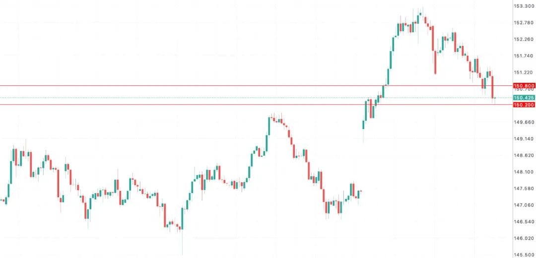 周四交易时段,美元兑日元跟随美元指数回落。日内最高测试151.40水平,截止收市最低触及150.22水平。